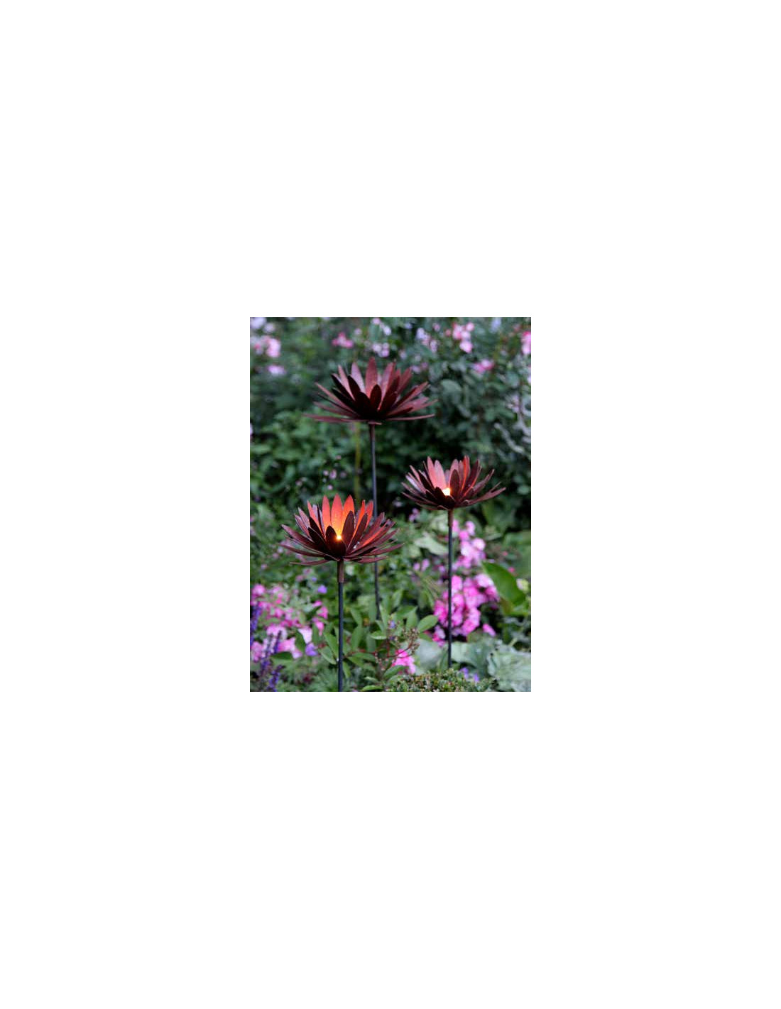 Unsere Chrysantheme ist eine aufwändig gearbeitete Blüte aus Edelrost. Die Rost-Blütenblätter können nach Belieben gebogen werden und eignen sich als Dekoration für Terrasse und Balkon. Eine Dekoration mit Teelicht oder Stabkerze ist möglich. Die angegebenen Maße beziehen sich auf die äußeren Blätter in flachem Zustand. Die Blüten werden in vorgebogenem Zustand geliefert und können in ihrem Aussehen noch variiert werden.