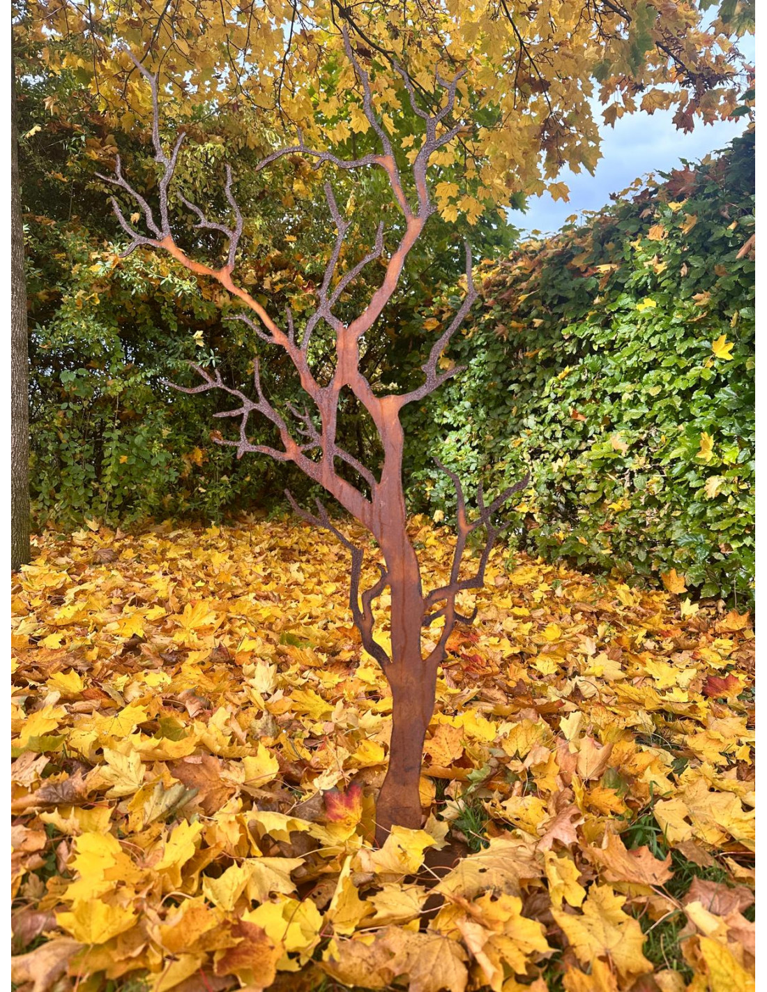 Der knorrige Edelrost Baum besticht durch seine Einzigartigkeit - ein edles Wohnaccesior.