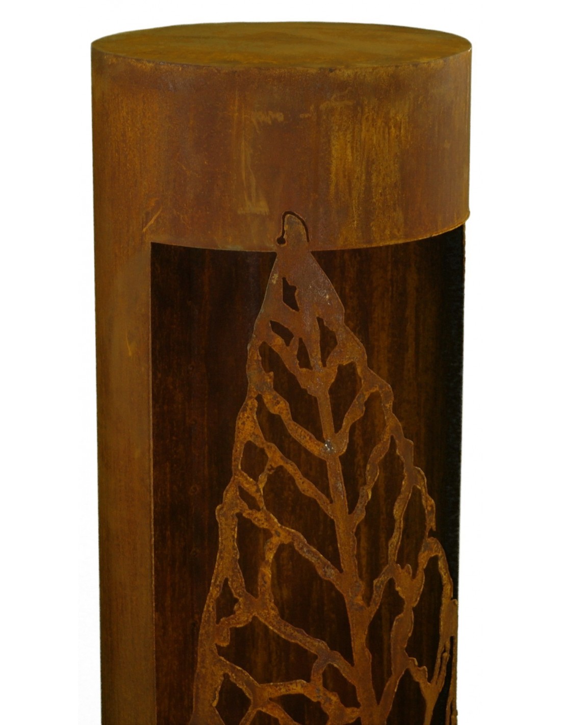 Runde Säule mit Standfuß. Die Hälfte der Säule ist offen, ein Blattgerippe ist ausgelasert. Die Säule ist oben geschlossen, so dass Sie eine Schale draufstellen können.