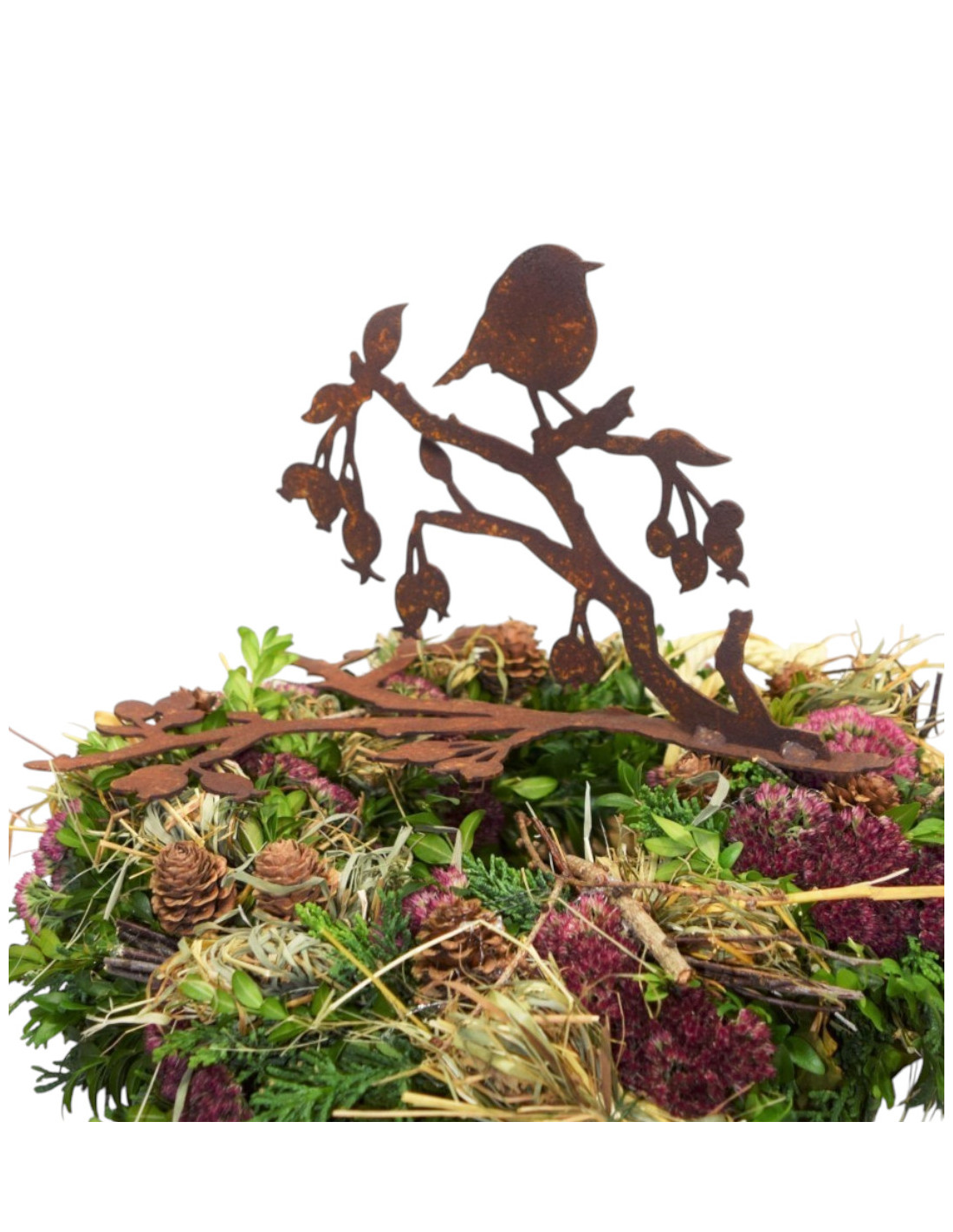 Edelrost Vogel auf Ast mit Hagebutten - für Glasschalen - Höhe 17 cm - Länge 29 cm