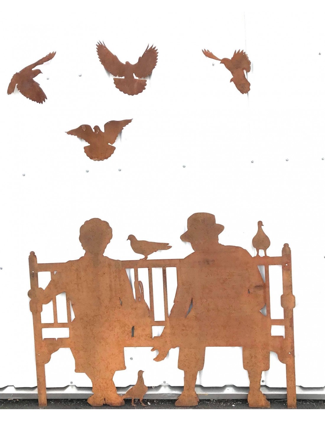 Die Rostbilder sind aus einem Stück gefertigt. Es befinden sich 2 Montagelöcher in dem rostigen Bildern. Die Rosttauben passen wunderbar zu dem Wandbild Rentnerpaar auf Bank. Wir empfehlen Ihnen, Abstandhalter zwischen Wand und Wandbild zu befestigen, damit das Rostbild nicht abfärbt. Sollte das Bild im Außenbereich befestigt werden, empfehlen wir Ihnen, das Bild vorher mit Owatrol zu behandeln.