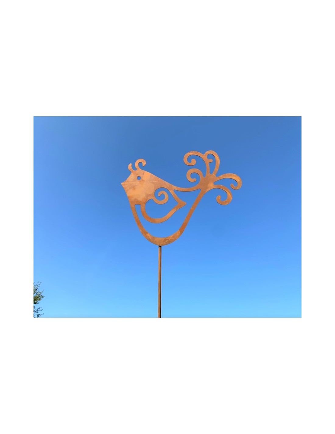 Edelrost Vögelchen auf Gartenstab