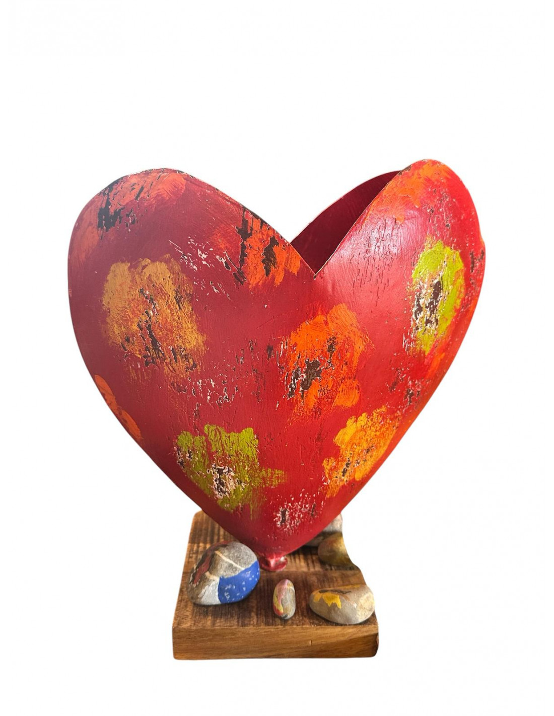 bunt bemaltes Metall Herz 3D - auf Holzsockel