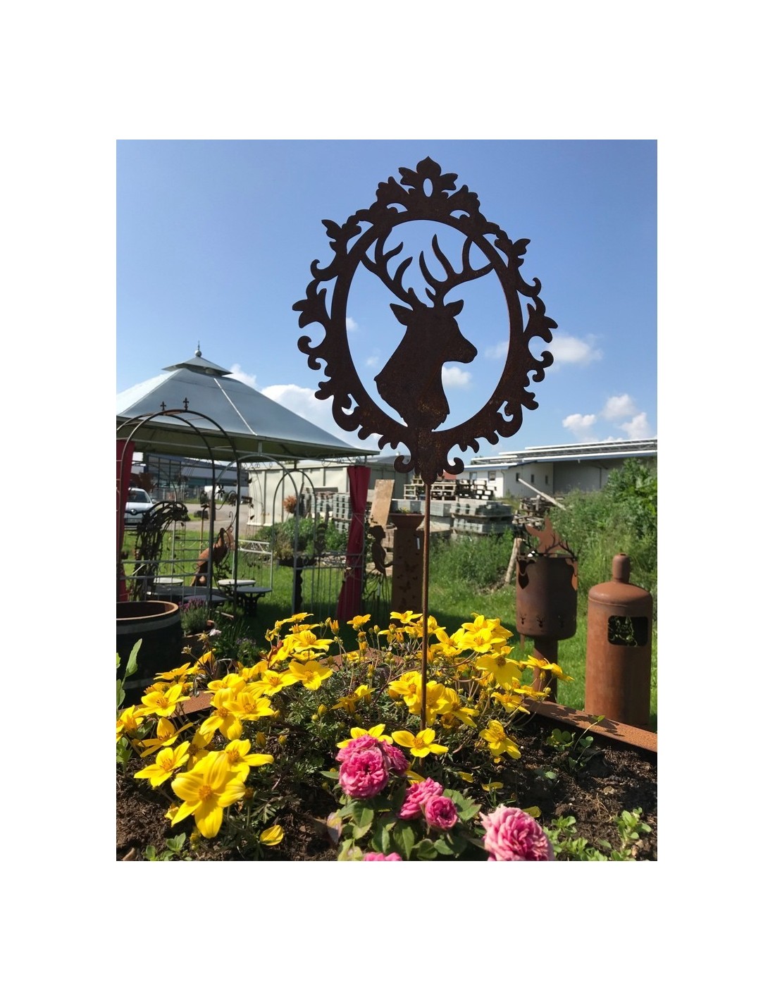 Edelrost Hirsch im Barockrahmen mit Stab zum Stecken in Blumentöpfe, Beete etc. Schöner Blickfang in der Herbst- und Weihnachtszeit.