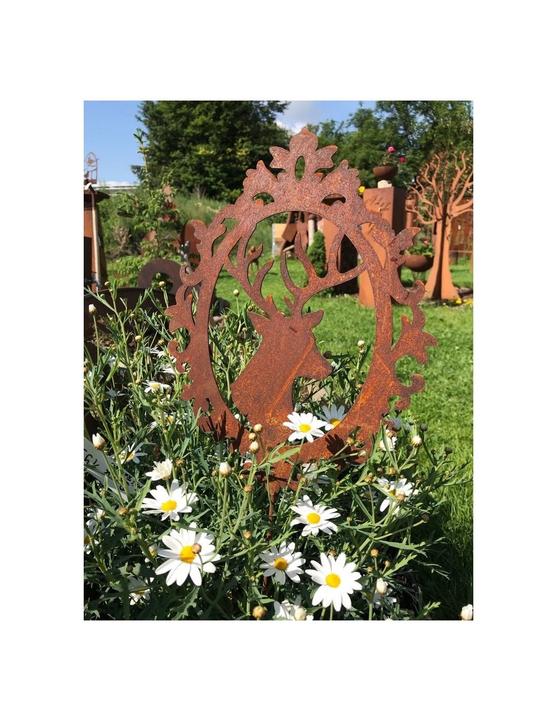 Edelrost Deko Hirsch im Barockrahmen mit Stab zum Stecken in Blumentöpfe, Beete etc. Schöner Blickfang in der Herbst- und Weihnachtszeit.