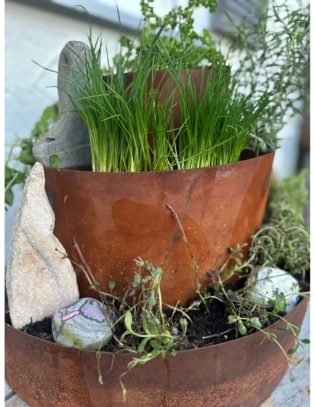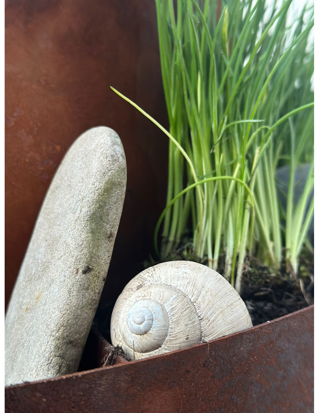 Eine Kräuterschnecke trägt ihren Namen, weil ihre Form an ein geöffnetes Schneckenhaus erinnert. Viele Modelle bestehen aus Stein – eine Kräuterschnecke aus Metall ist dazu eine besonders dekorative und langlebige Alternative. Die Edelrost-Oberfläche erinnert farblich an warmen Sandstein und verleiht deinem Garten eine natürliche, rustikale Ausstrahlung.