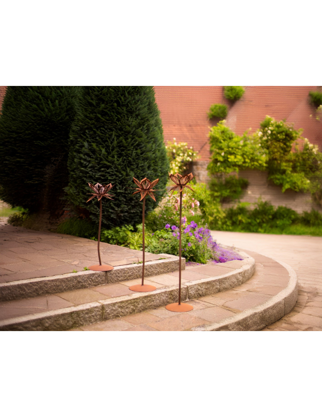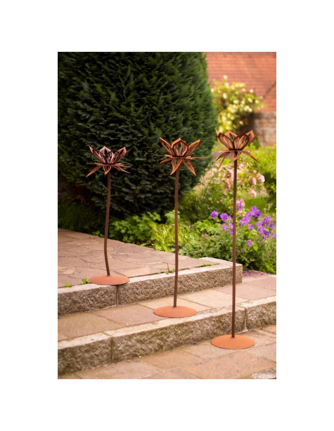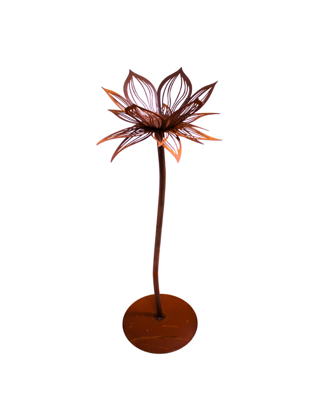 Diese zarte Lotusblume aus Edelrost-Metall ist 84 cm hoch und bringt mit ihrer filigranen Gestaltung und der integrierten Glaskugel eine besondere Atmosphäre in deinen Garten. Ob als dezenter Blickfang zwischen deinen Pflanzen oder als stilvolle Ergänzung auf der Terrasse – sie verleiht deinem Außenbereich eine harmonische Note.