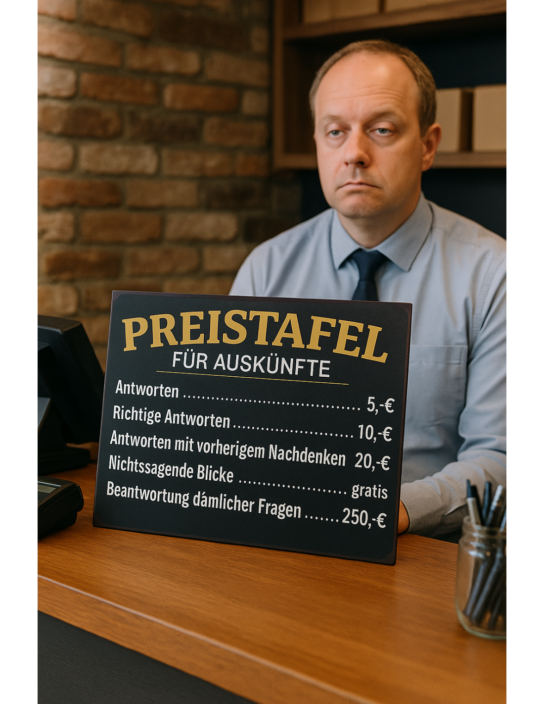 Dieses Metallschild ist ein absoluter Blickfang für alle, die Humor lieben. Mit der witzigen Aufschrift „Preistafel für Auskünfte“ werden Antworten aller Art charmant bepreist: Standard-Antworten kosten 5 €, richtige Antworten 10 €, nachdenklichere Antworten 20 €, nichtssagende Blicke gibt’s gratis – und wer „dämliche Fragen“ stellt, zahlt 250 €.