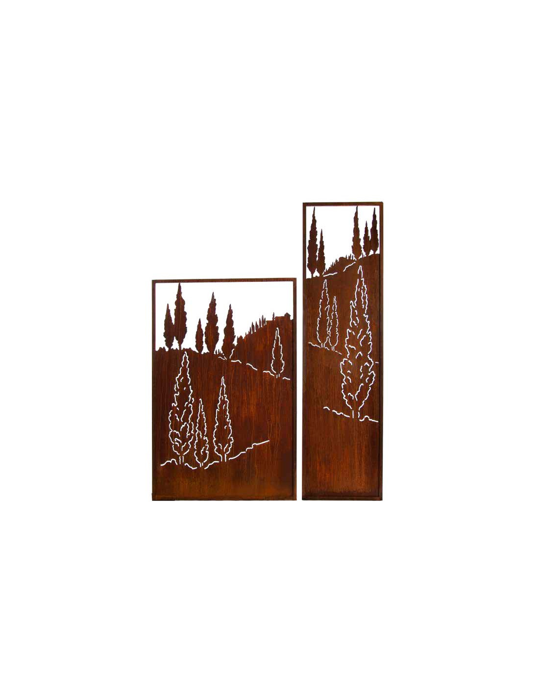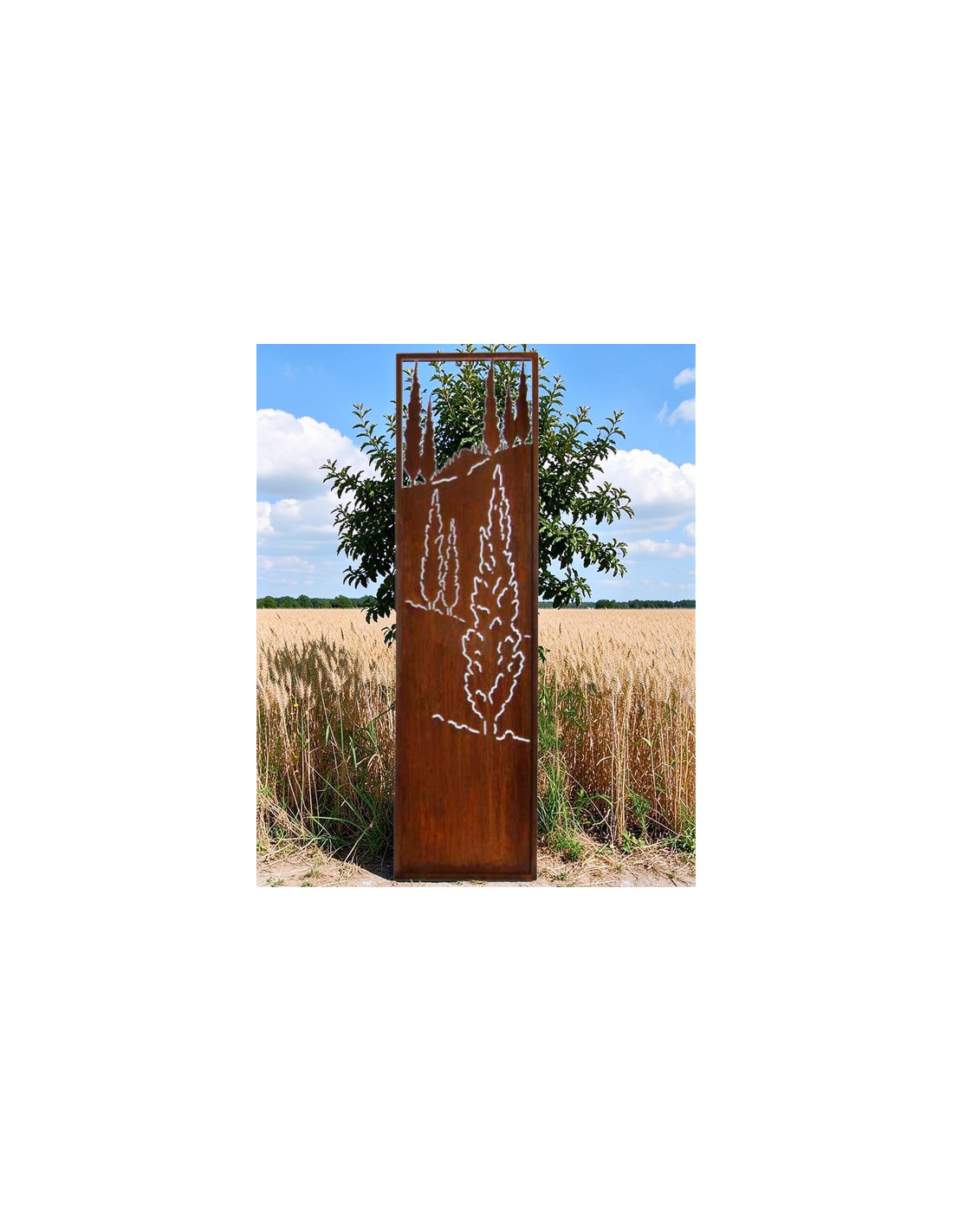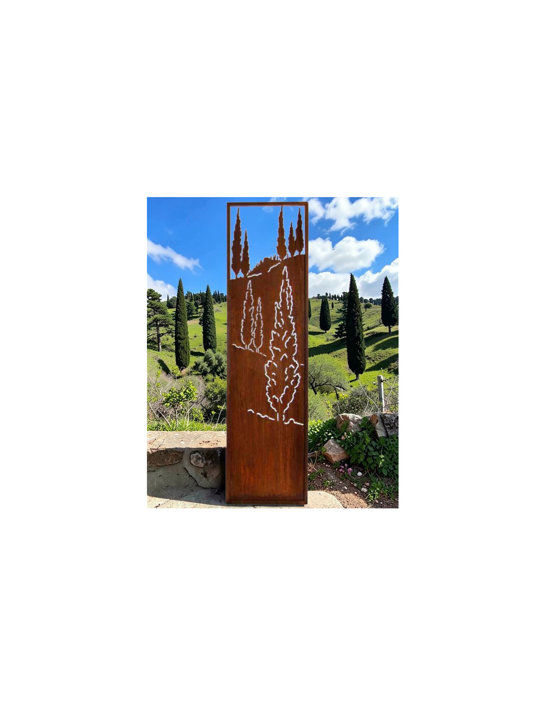 - Diese schmale Sichtschutzwand mit einer klassischen italienischen Landschaft, Hügeln und Thuja eignet sich ideal als Ersatz für eine Lücke in einer Hecke. Das Motiv ist unten blickdicht und nach oben hin offen