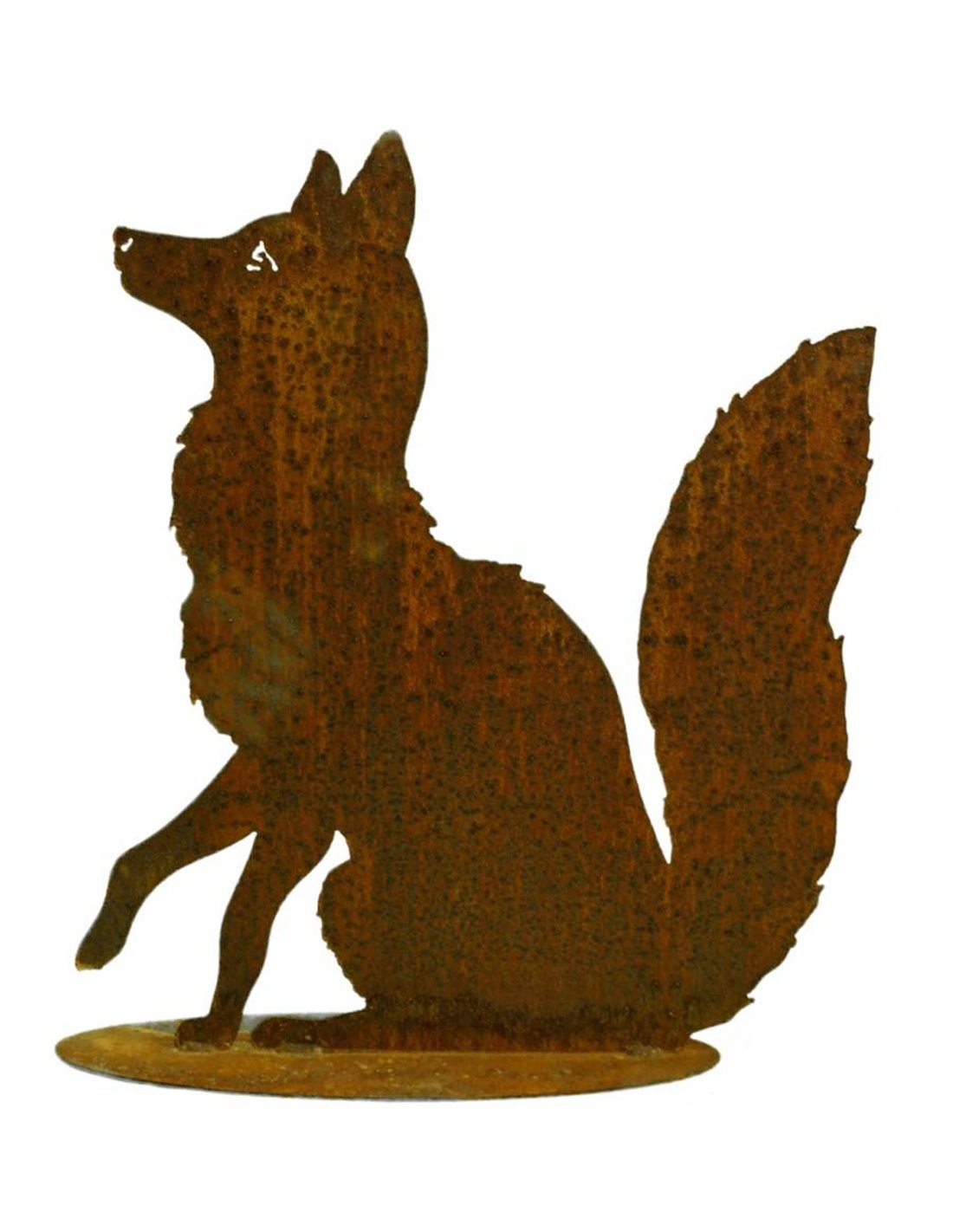 Dekorativer Edelrost-Fuchs, sitzend auf Platte