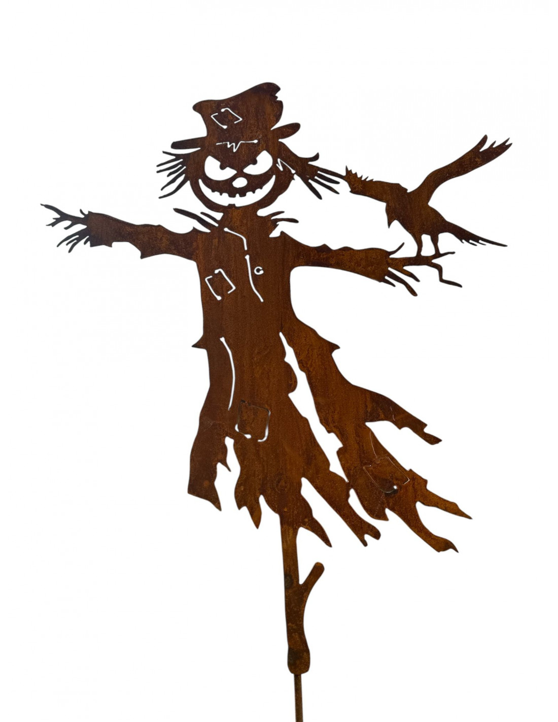 Diese Vogelscheuche ist mit einer Körpergröße von 80 cm Höhe ein richtig großes Deko-Objekt. Deshalb ist unten kein Stab angeschweißt, sondern ein Rohr für eine Eisenstange. Du kannst die Vogelscheuche so auf einen Holzpfahl montieren, oder die Eisenstangen als Zubehör mit bestellen.