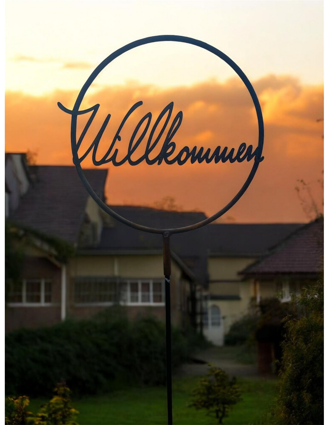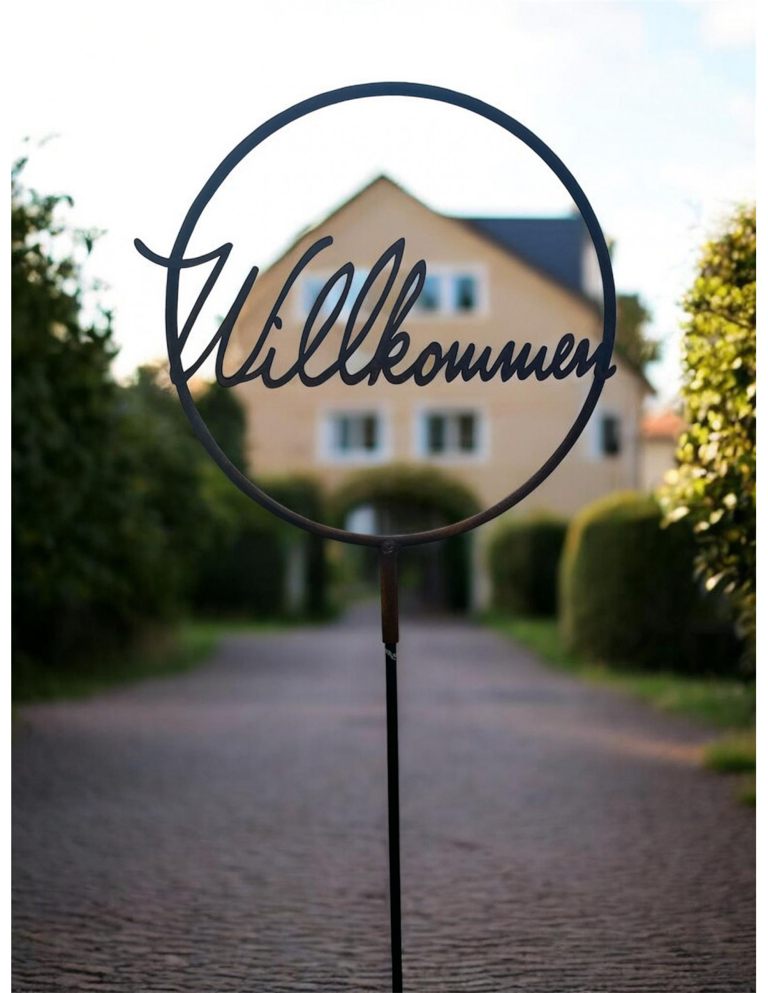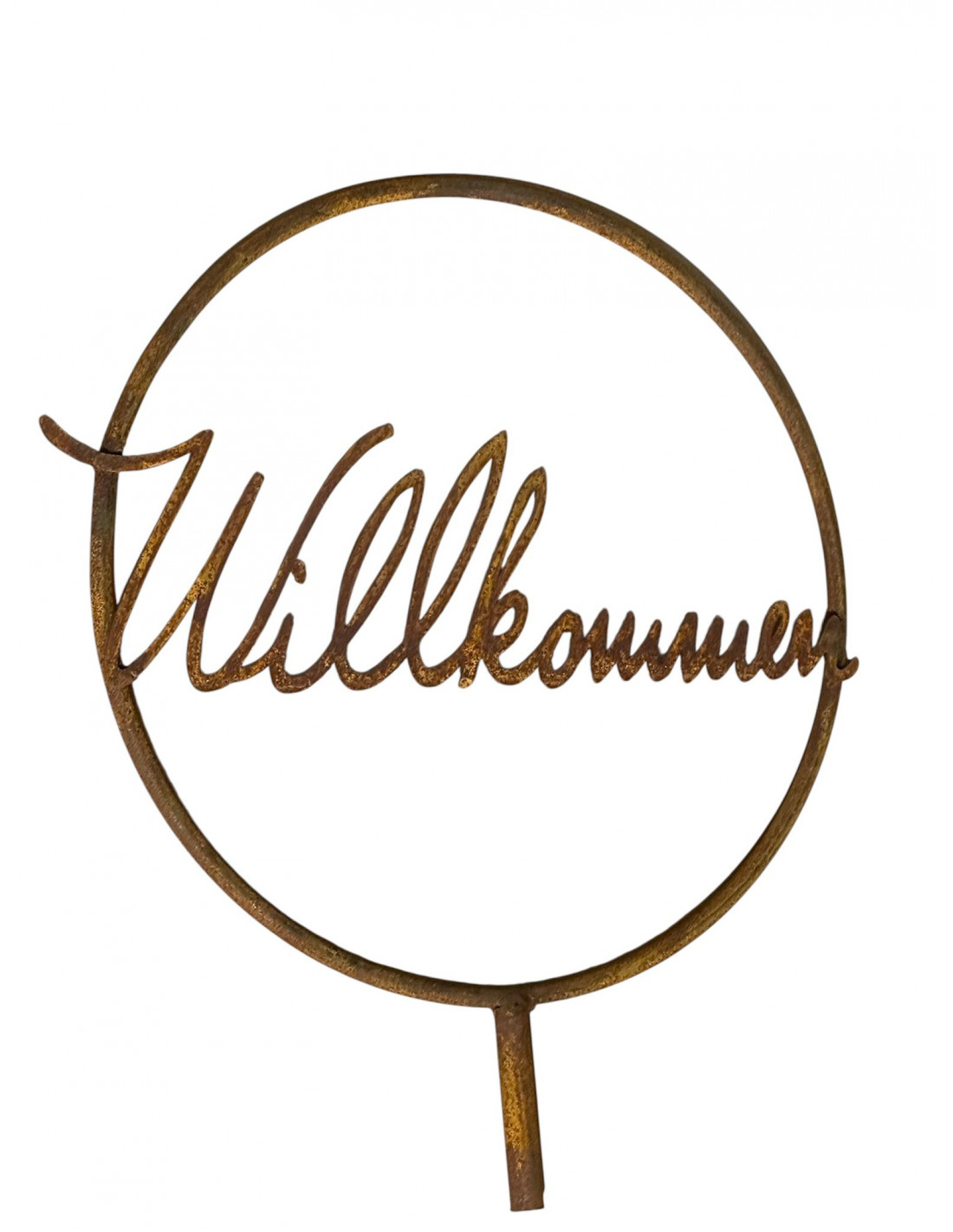 - schöner Willkommen Schriftzug aus Metall im 30 cm großen Metallring mit Steckhülse für eine Eisenstange oder zum Befestigen auf Holzbalken etc.